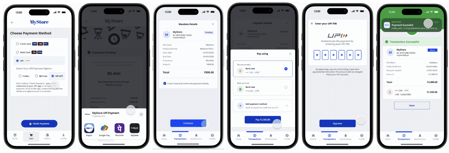 upi-intent-autopayflow, mobile users select their preferred UPI app or choose the "Other UPI app" option at checkout before proceeding with payment. Upon clicking to pay, they are redirected to their chosen UPI app. The app then loads the pre-filled payment details and prompts the user to enter their UPI PIN for authentication, completing the transaction.Request