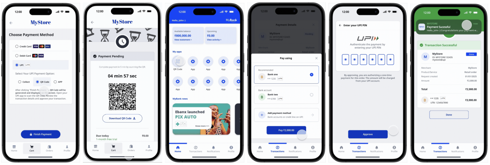 upi-qrcode-autopayflow, users scan a QR code, which redirects them to their UPI app to complete the transaction. Upon redirection, the UPI app loads the pre-filled payment details and prompts the user to enter their UPI PIN for authentication, finalizing the transaction.Request