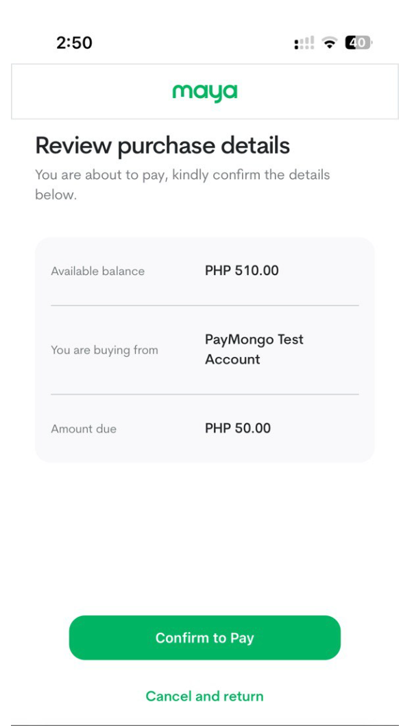 - The customer can confirm the transaction by tapping “Confirm Payment” in the Maya app.