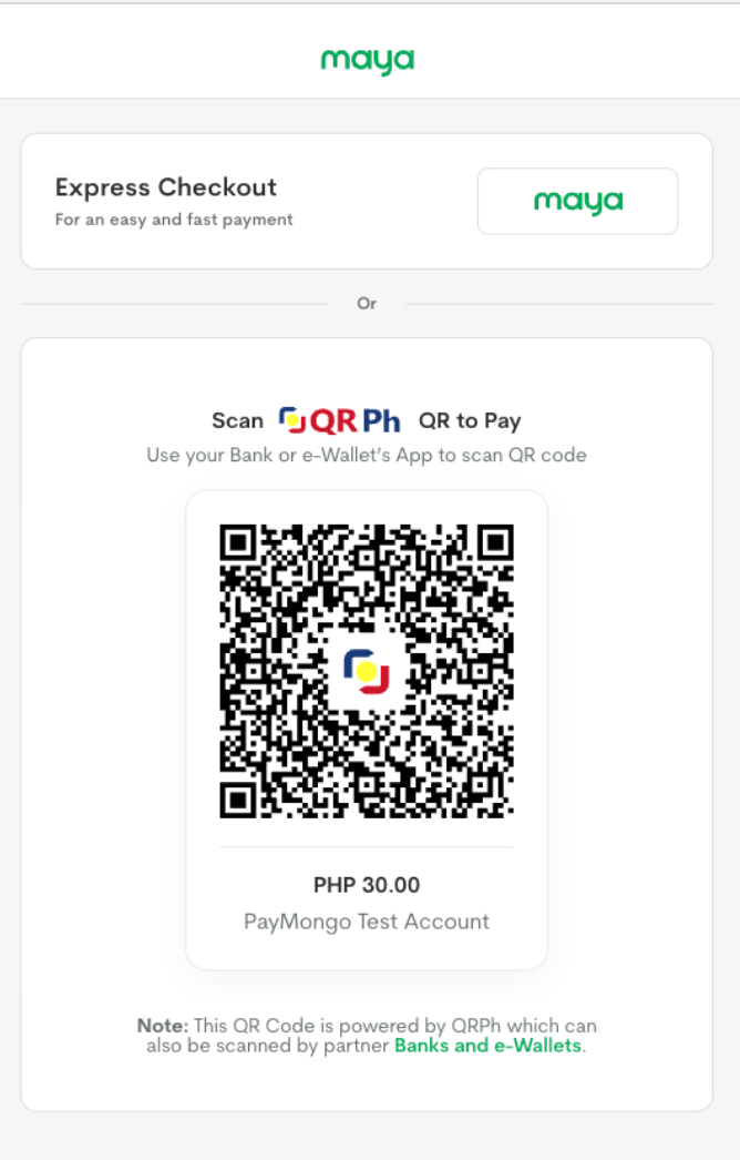 If the customer is paying by mobile and has the Maya app, the mobile flow activates automatically via our API-provided address. If using a web browser, this link will display a dynamic QR code to open the Maya app on their phone.