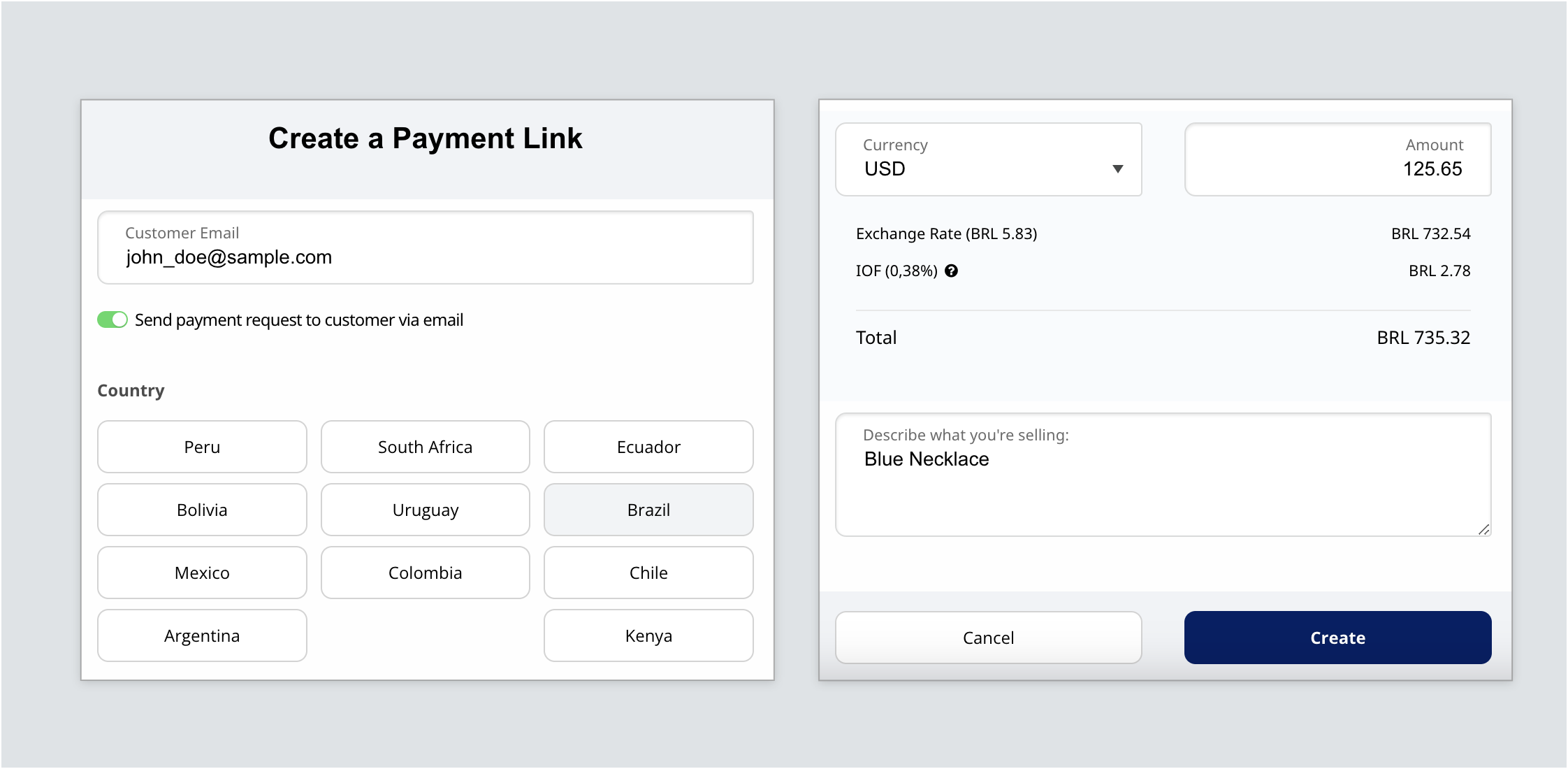 Create → Payment LinkComplete the form by providing the customer's email, country, transaction amount and other info. See next step for details about form fields.